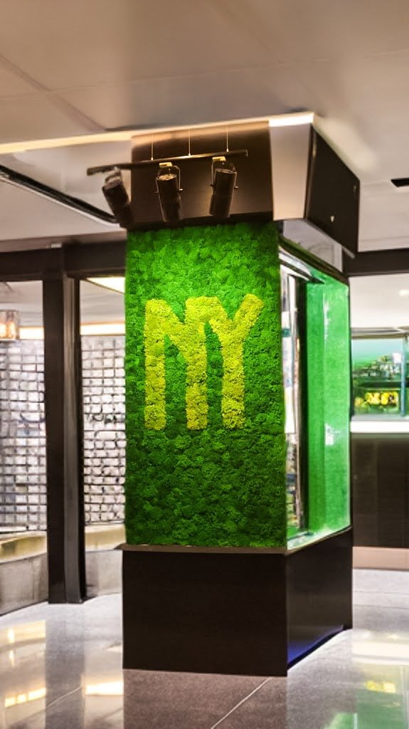 • Мохові логотипи — мох викладається поверх основи з фанери або МДФ у вигляді напису, знака або фігури, повністю приховуючи його під рослинним шаром.