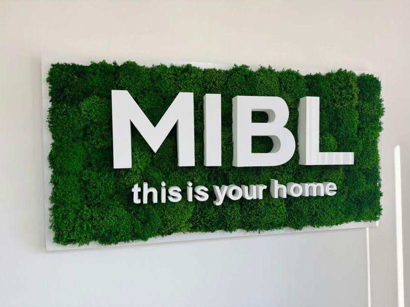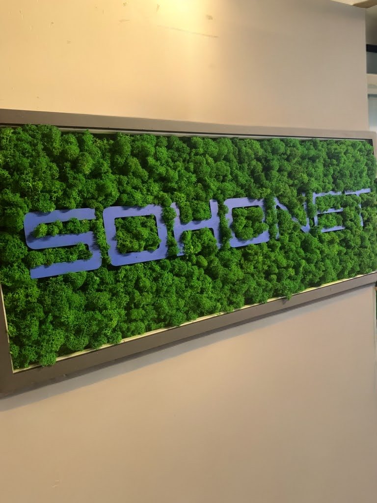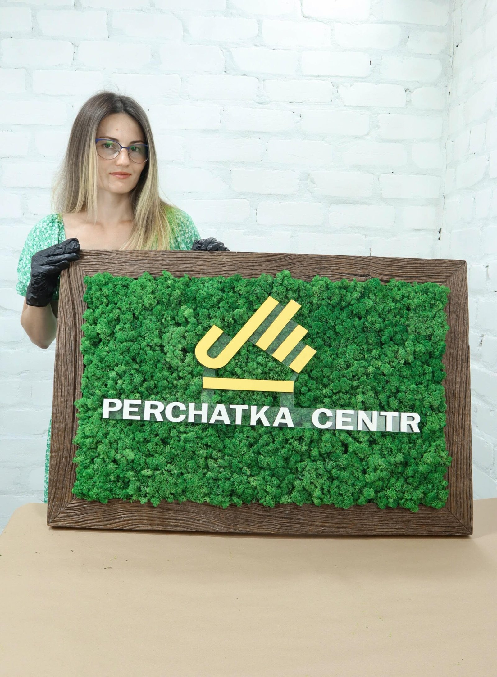 • Логотип з акриловими літерами на тлі моху з підсвічуванням або без нього — виготовляється на твердій основі (МДФ або фанера). Поверх основи кріпиться стабілізований мох.