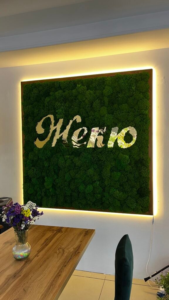 Рекомендуємо плоскі та об’ємні логотипи, в яких використовуємо різну основу та види моху. Логотипи можуть поєднувати рослини, дерев’яну основу, а також деталі з акрилу чи металу — залежно від дизайну. Виконуємо фарбування моху та монтаж підсвітки для яскравих акцентів та індивідуальних рішень.